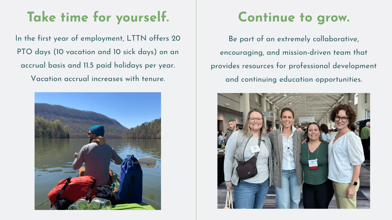 Please check back often for future opportunities with The Land Trust for Tennessee. If you have any questions please contact Kayla Noel, Director of HR & Organizational Culture at [email protected].