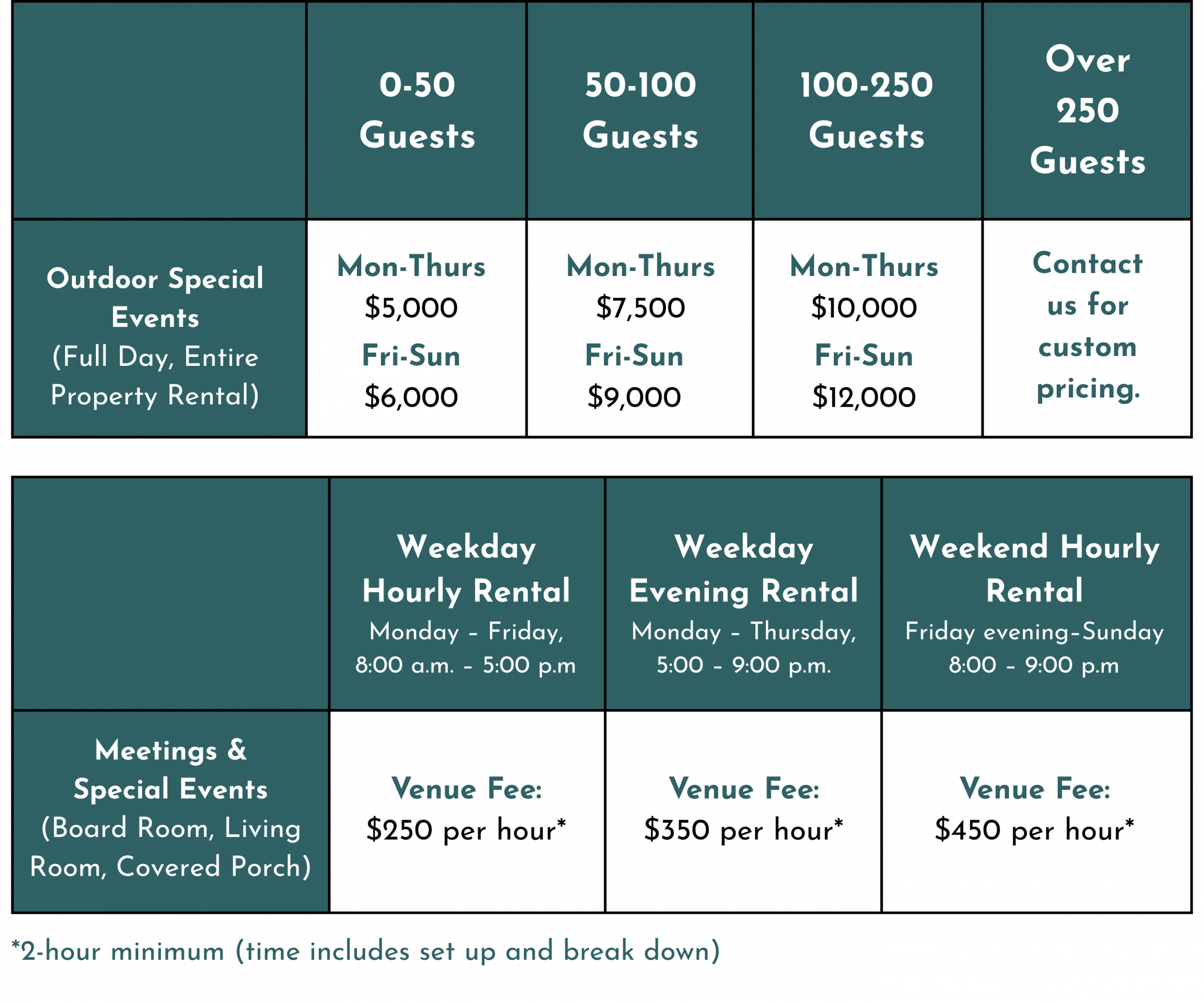 Rates will vary depending on the date and number of guests. Nonprofit discount available.