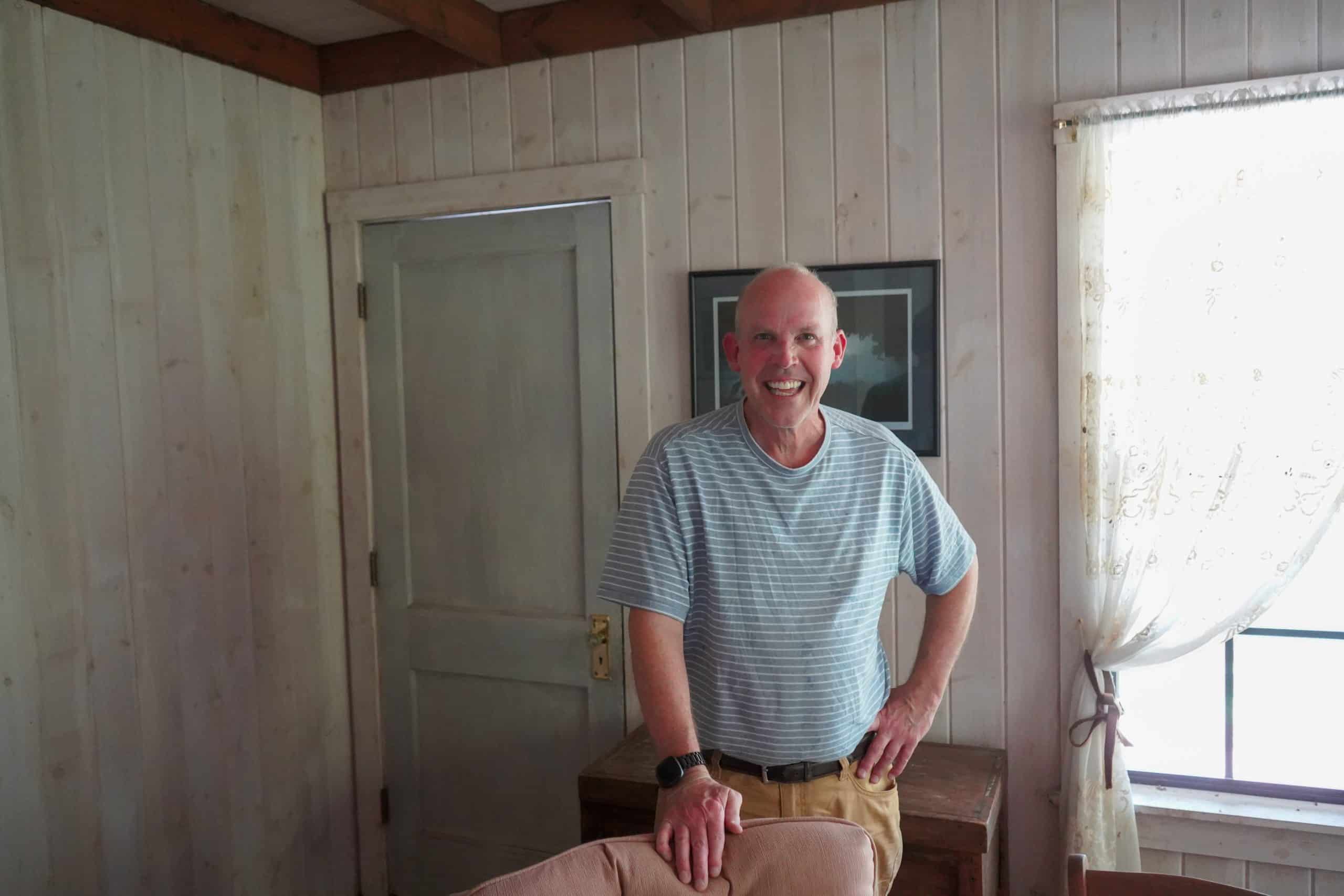 - Stephen inside the old cabin at Cherry Ridge Farm.