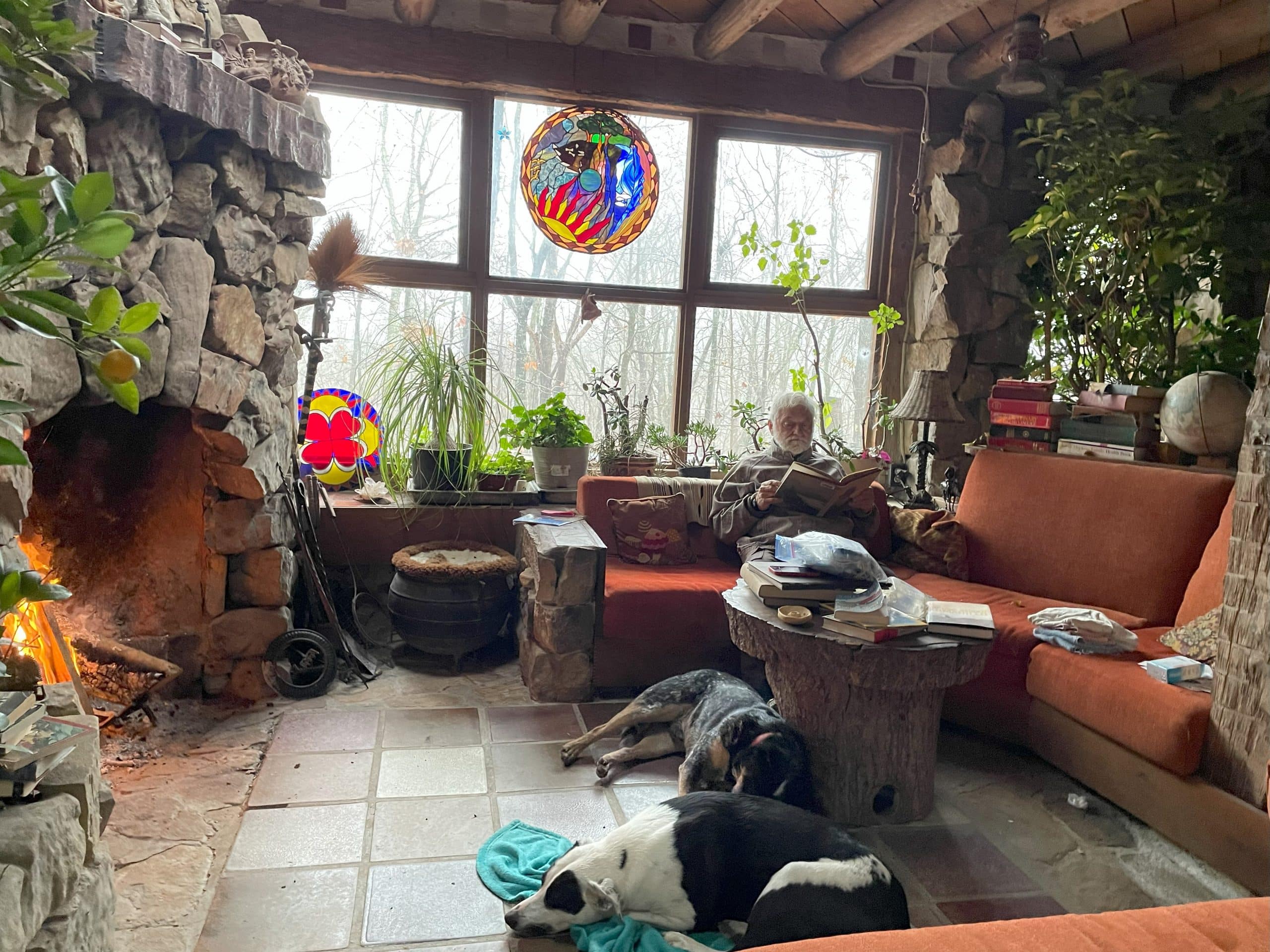 - Johnny Kimmons reading in the Moonshadow inglenook by the fire with Gnarly and Spinoza. Built by hand by Johnny and Carol, family and friends.