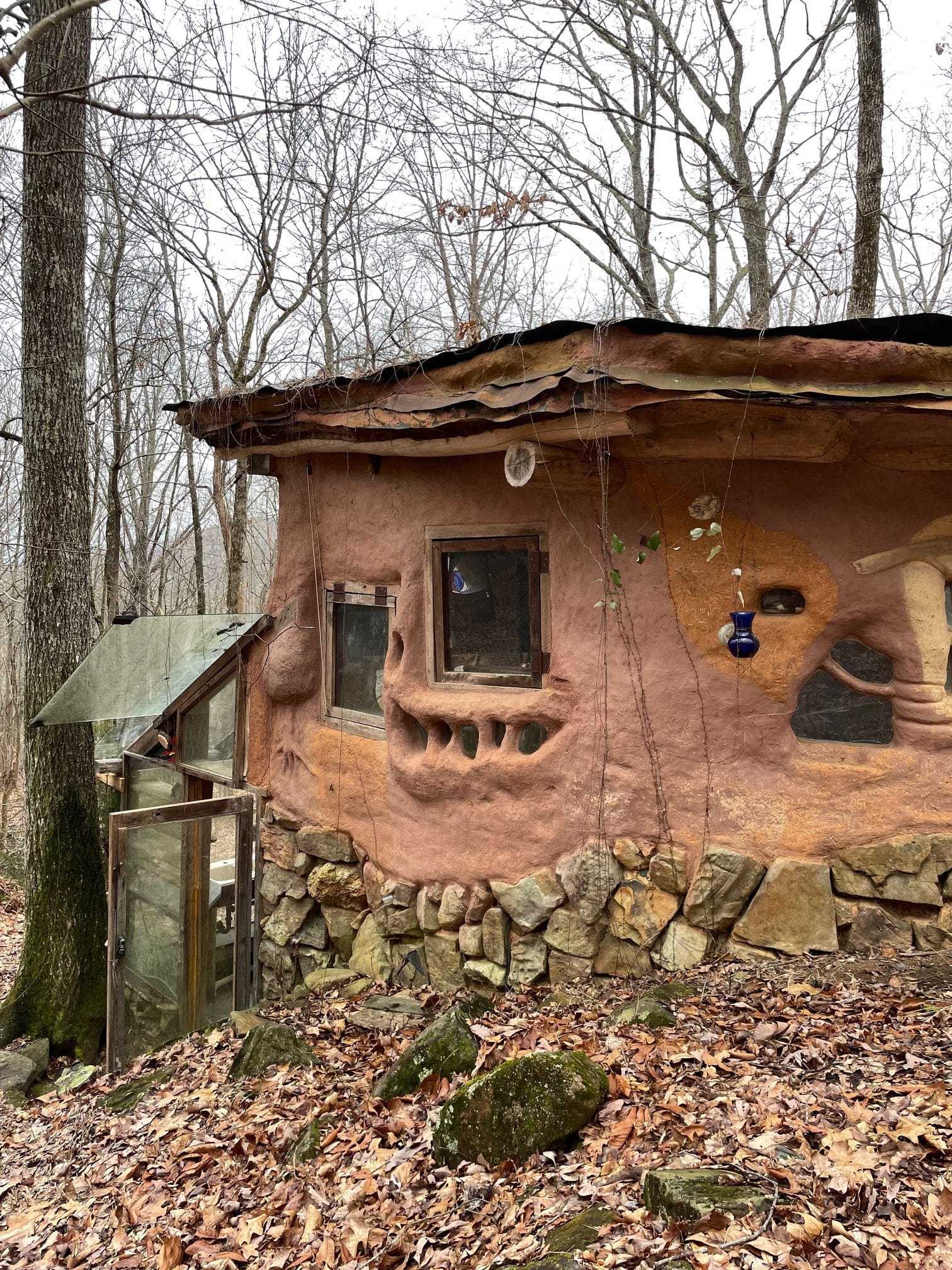 - Mud Dauber, built of “cob”, made by hand and foot with clay from the hillside mixed with straw. It is now a temporary shelter for visitors.